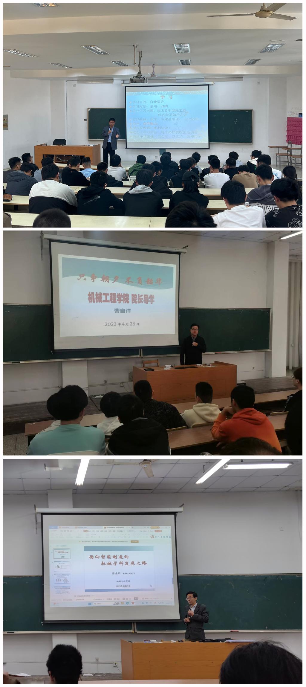 办学发展历程,指出大学是人生中最为关键的阶段,就如何学会学习、学会做人和学会做事等与学生进行了交流和分享,鼓励同学们多读书、读好书、勤思考、多实践,树立远大理想,在实践探索中明确大学的努力方向和人生奋斗目标;曹自洋在生涯规划导学会上运用详实的数字和案例帮助同学们对所学专业的发展态势、就业现状、科研发展路径等方面有了更加深入的理解;蒋全胜以“面向智能制造机械学科的发展之路”为题,针对机械大类中各个细分专业作详细介绍,寄语同学们要以发展的眼光看问题,结合爱好与自身能力,热爱专业,潜心科研,注重创新。