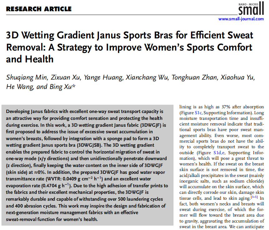 2022级硕士研究生闵书强以第一作者分别在国际TOP期刊《Chemical Engineering Journal》(影响因子13.3)发表题为“Mechanical stretching triggered smart Janus fabrics for dynamic personal moisture/heat management”和《Small》(影响因子13)发表题为“3D Wetting Gradient Janus Sports Bras for Efficient Sweat Removal: A Strategy to Improve Women's Sports Comfort and Health”的研究论文,我校为唯一通讯单位,导师许兵副教授为唯一通讯作者。