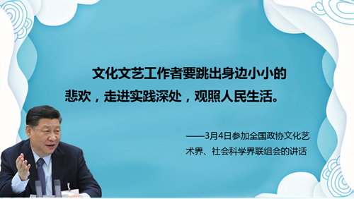 1、文化文艺工作者要跳出身边小小的悲欢,走进实践深处,观照人民生活。