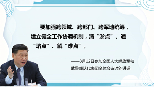 【原文】要搞好全局统筹,统好任务计划、力量资源、管理流程,确保各项建设有序推进。要把好项目论证质量关,创新审批方式,提高立项审批效率。要加强跨领域、跨部门、跨军地统筹,建立健全工作协调机制,清“淤点”、通“堵点”、解“难点”。要密切军地协同,用好各方面优质力量和资源。