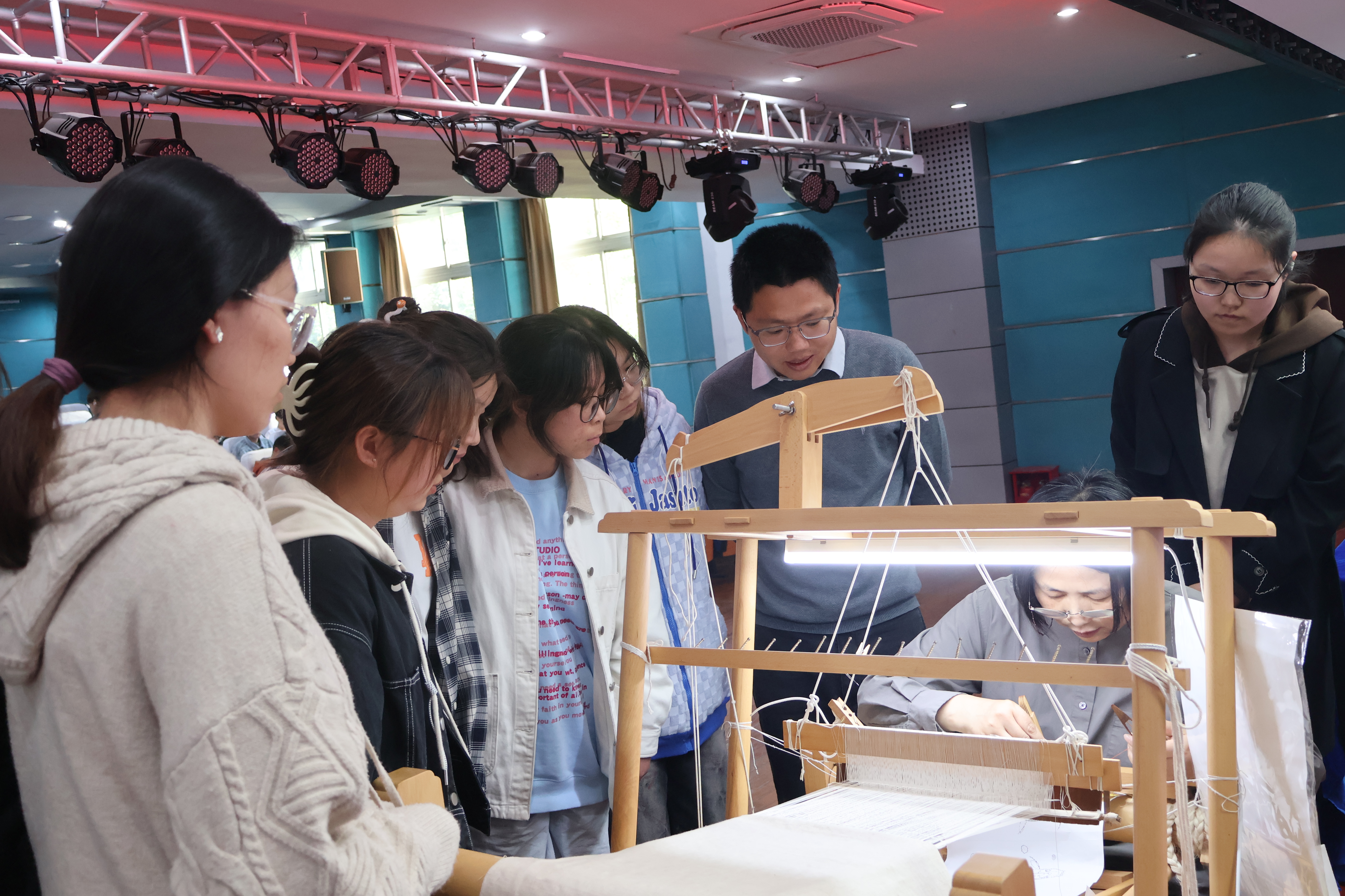 陈文以《刻在时间里的丝路》为题围绕缂丝的历史、制作过程以及发展现状等三个方面,与大家分享缂丝的古艺新生,多角度诠释缂丝的艺术之美与实用之道。讲座后,陈文进行现场传授技法,很快“圈粉”不少师生。