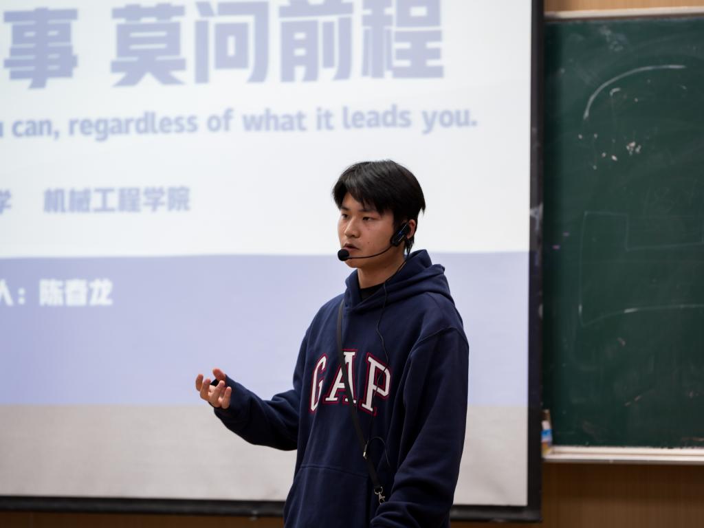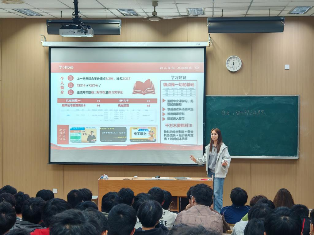 以崔欣彤为代表的宣讲团向25级新生展示了他们丰富多彩的学习、科研、志愿活动、社团及学生组织等方面的校园生活。23级机电崔欣彤以专业第一的优异成绩和丰富的竞赛经历,为新生树立了榜样。她强调合理规划与课堂效率的重要性,要坚持预习复习。在科创方面,她分享了自己从软件学习到带队参赛的成长路径,并积极参与志愿服务。她以“最好的时间就是现在”鼓励新生勇敢尝试,脚踏实地。此外,其他优秀的学长学姐也分享了宝贵经验。22级机械汪何学长结合自身经验,指出英语、专业能力与学术成果在升学中的关键作用,鼓励同学们明确目标。23级机械孙煜学长提出以扎实学习为核心、主动破局、迎难而上的方法给新生借鉴学习。