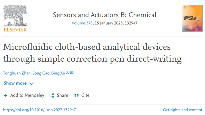 许兵老师指导本科生詹童欢、高嵩分别以第一、第二作者身份在国际微流控顶级期刊《Sensors and Actuators B: Chemical》(影响因子9.221,一区TOP)发表题为 “Microfluidic cloth-based analytical devices through simple correction pen direct-writing”的研究论文,我校为唯一通讯单位,许兵副教授为唯一通讯作者。