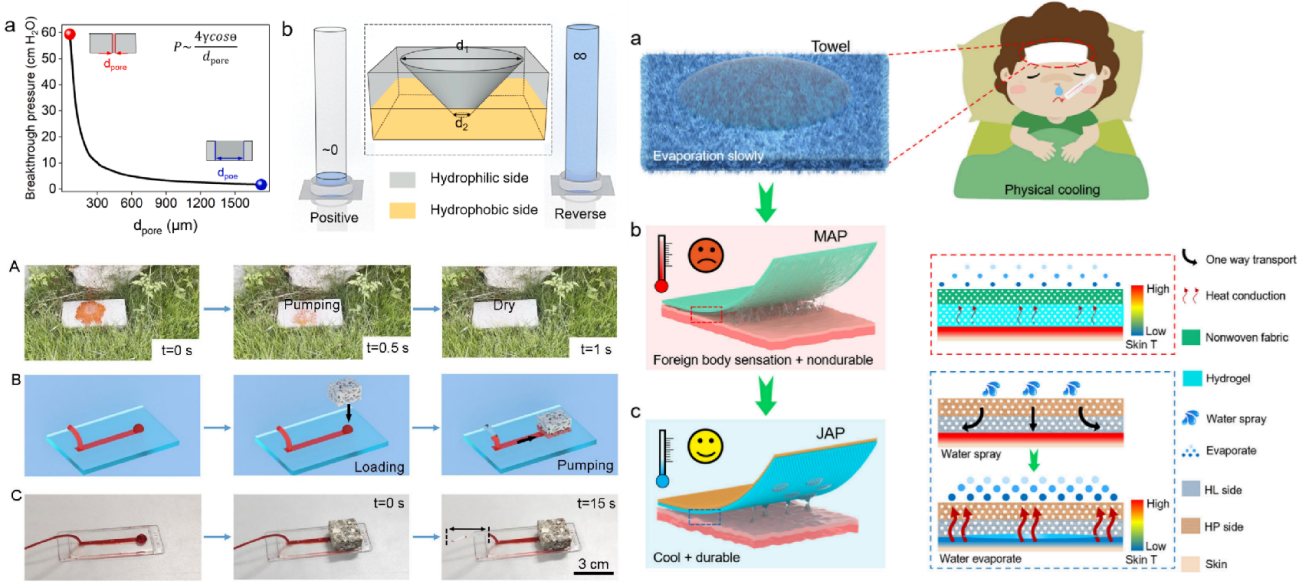 二区,影响因子高达8.3)上发表了题为“Janus Antipyretic Pastes for Efficient, Durable and Comfortable Personal Physical Cooling”的研究论文。该研究创造性地反转Janus织物单向导湿特性,并将其巧妙融入退烧贴设计中。结合工程智慧,他们还设计了一套外部供水系统,这一创新不仅大幅提升了退烧贴的降温效率与持久性,更确保了佩戴过程中的极致舒适度,为发热患者提供了更加安全、舒适的物理降温方案。